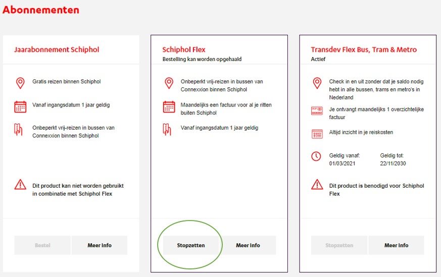 Both must be renewed annually. The day after your annual subscription expires, you can reactivate the annual Schiphol subscription in your account. For Schiphol Flex this is the separate 'Schiphol Flex' subscription that is available in your account. You can then pick it up directly at a pick-up point, which you can also find on the side of our buses next to the front boarding door.